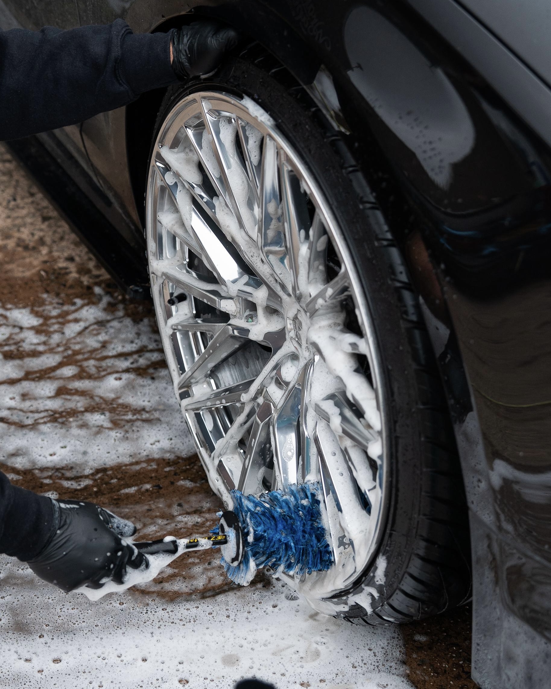 The EZ Detail Brush features an amazing, bendable stem that bends to the contours of your wheels. It’s so flexible; you can bend the top half of the brush to one side and then insert it between the spokes to clean the interior rim of the wheel (the side that faces underneath the vehicle).